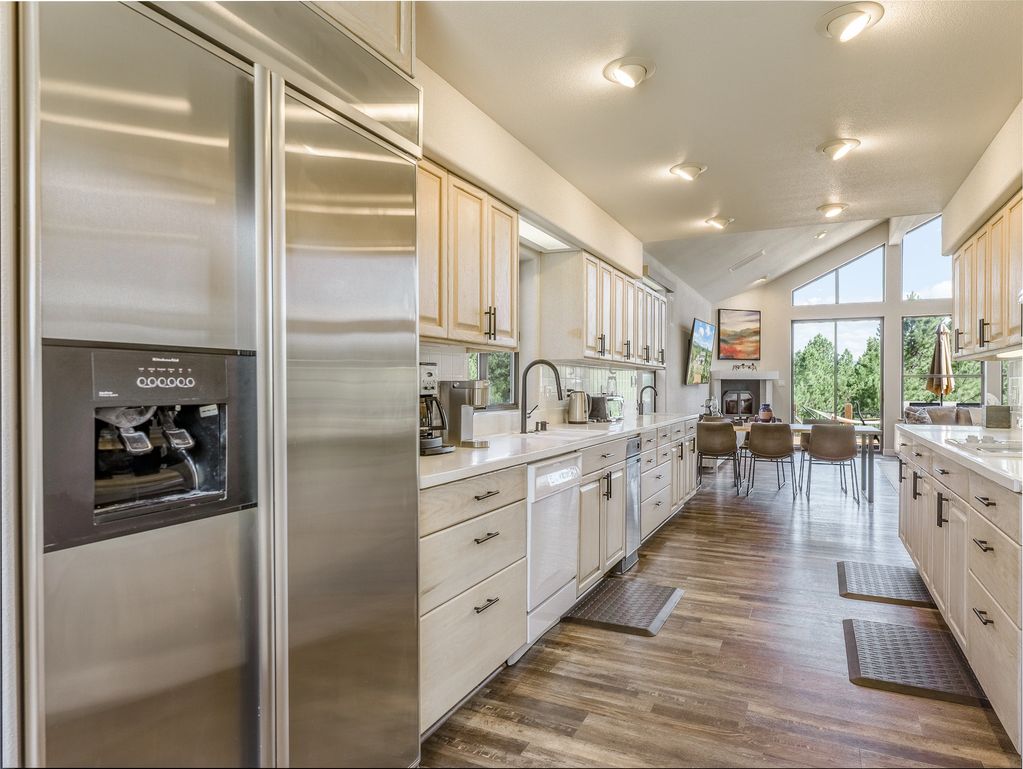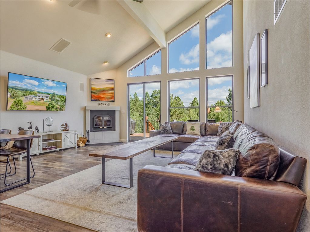 MAIN LEVEL: The main floor has a luxurious living room with an enormous wall of windows overlooking the pines and Wheeler Peak. The 15 foot long custom leather sectional can fit the whole family, along with an 8 foot long coffee table to hold all the drinks and snacks for watching movies and shows on the 75” smart tv. The living room is part of a great room area connected to the kitchen and dining