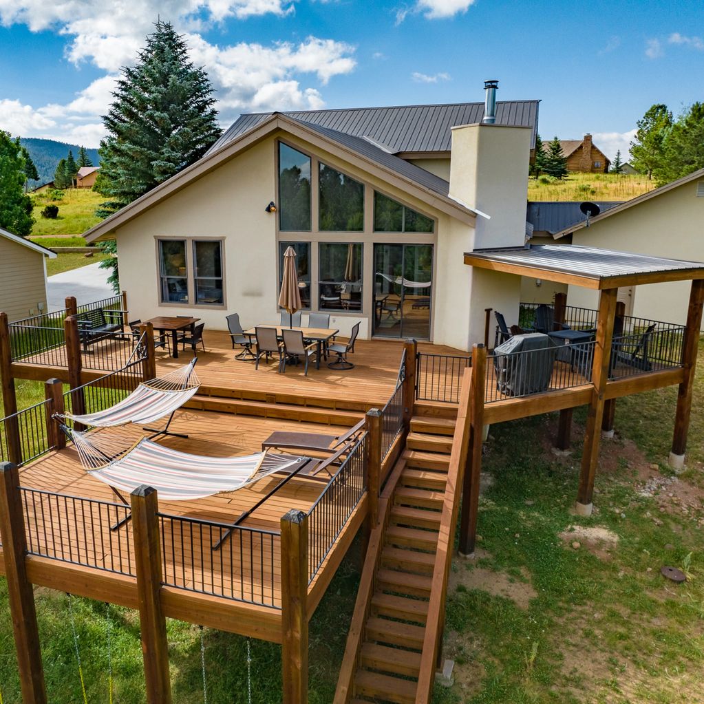 We provide the backdrop for creating great family memories during your mountain getaway, such as an expansive deck with Adirondack loungers, traditional loungers, bench swing, hammocks, and two dining ensembles where you can enjoy morning coffee or evening happy hour and watch the wildlife. An outdoor fire pit table lets you bask in the warmth of a cozy fire on a chilly night with the turn of a button. Below the deck are playground-style swings for kids and even a bucket swing for toddlers. A perfect home layout with dining, kitchen, living and deck all on the same level to easily connect and socialize. A lower-level family retreat with arcade games, ping-pong, arts & crafts table, giant chalk boards, board games & large sectional sofa with 65” smart tv, so everyone has the space to play and enjoy the vacation. Access to the Angel Fire trail system is just steps away, from which you can walk/hike all around Angel Fire.